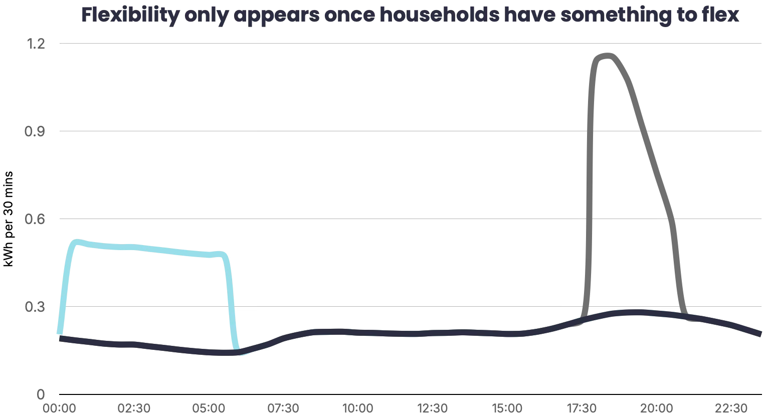 The chart below makes this difference tangible. In a household without an EV, the evening peak dominates the load profile. Add an EV without coordination and that peak often worsens, as charging piles on top of existing demand. Introduce smart charging, however, and something finally shifts: demand moves into the night and the shape of the day begins to change.