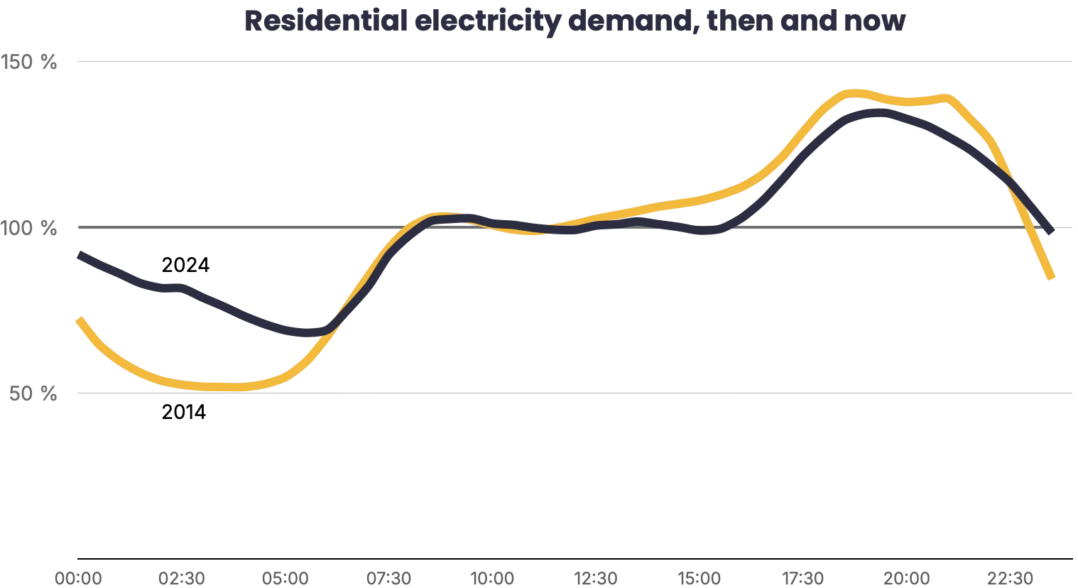 If you compare an average weekday residential load profile from years ago with one from today, the two lines almost sit on top of each other. The defining feature of the day, the evening peak, remains stubbornly intact, rising and falling with the same predictability it always did. The chart below plots the shape of household demand before (2014) and after (2024) the spread of smart meters and flexible tariffs. Whatever progress has been made behind the scenes, it has not yet translated into meaningful behavioural change at scale.